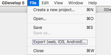 Para exportar un juego, haga clic / seleccione "Archivo" en el menú que se encuentra en la parte superior de la interfaz de GDevelop. Elija la opción "Exportar" de la lista desplegable.