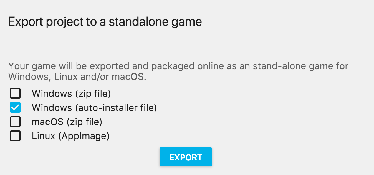Elige las plataformas para las que quieres exportar el juego. Para Windows, puede elegir si desea un solo archivo ejecutable o un archivo zip: