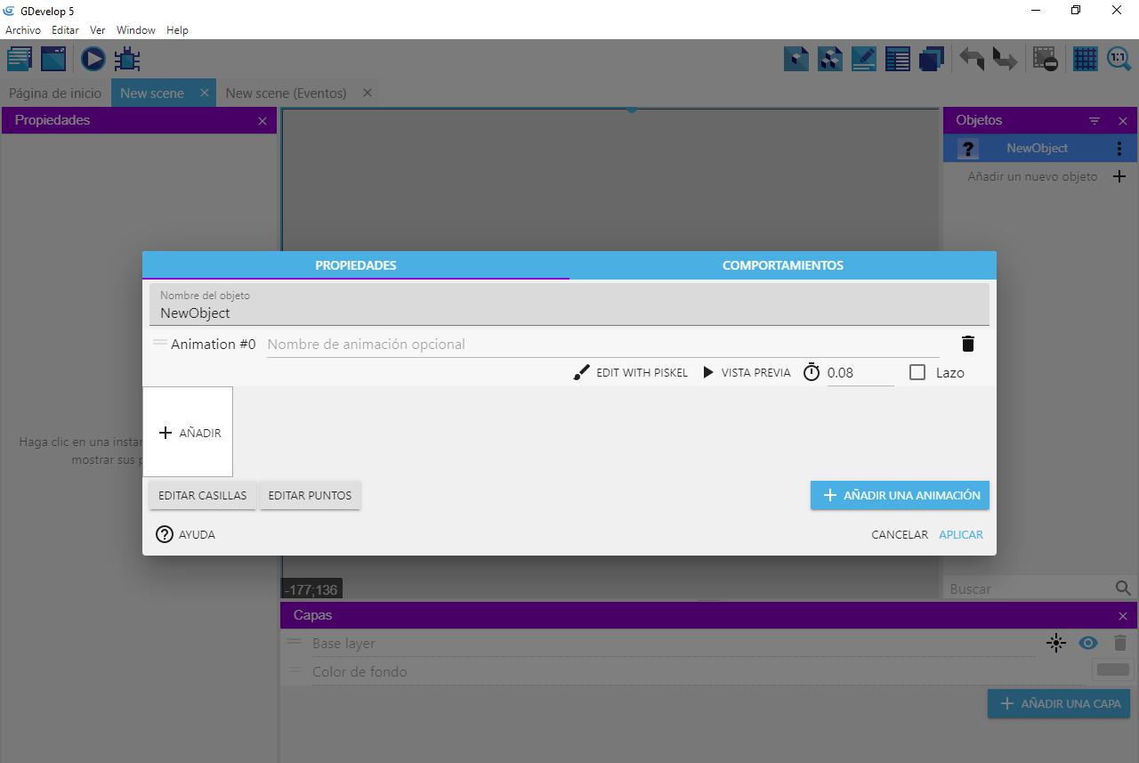 Diferentes tipos de objetos proporcionan características específicas. Para la mayoría de nuestros objetos, utilizaremos los objetos Sprite, que son objetos animados que se pueden usar para muchos elementos (jugador, plataformas, enemigos, elementos ...).