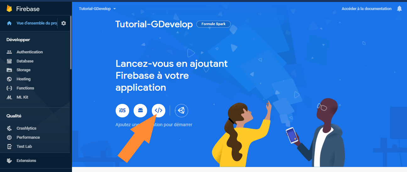 Les jeux GDevelop fonctionnent comme une *application web*, créés en donc une depuis Firebase  Mets un nom de ton choix et tu peux décocher la case "Firebase hosting". \<note\> A l'heure ou cet article est écrit il n'y a pas de possibilité d'utilisation de firebase hosting mais c'est possible que cela change Firebase devrait te montrer du code ressemblant celui-ci à present:  La seule partie nécessaire est *la configuration*, la partie entre les {}. Copie donc le contenu entre les {} **y compris les {}**. Chez moi ça serait: ```