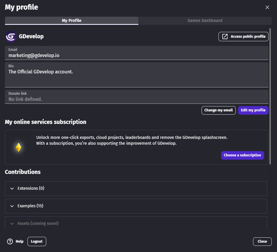 The profile page allows you to manage your GDevelop account, and customize what others see on your profile. This is also the place to manage your subscription. A GDevelop account is needed to use GDevelop services such as the one-click export of your game for Android, iOS, Windows, macOS, Linux, and gd.games.