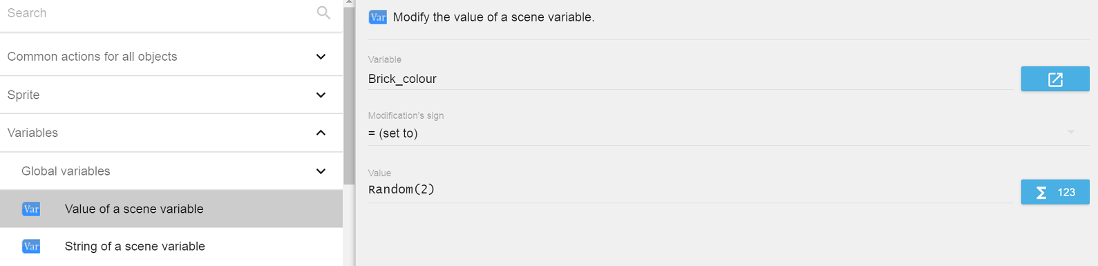 • In the Name of the external layout field, type "Layout" + ToString(Variable(Random_layout)). This will randomly add one of the external layouts to the scene.